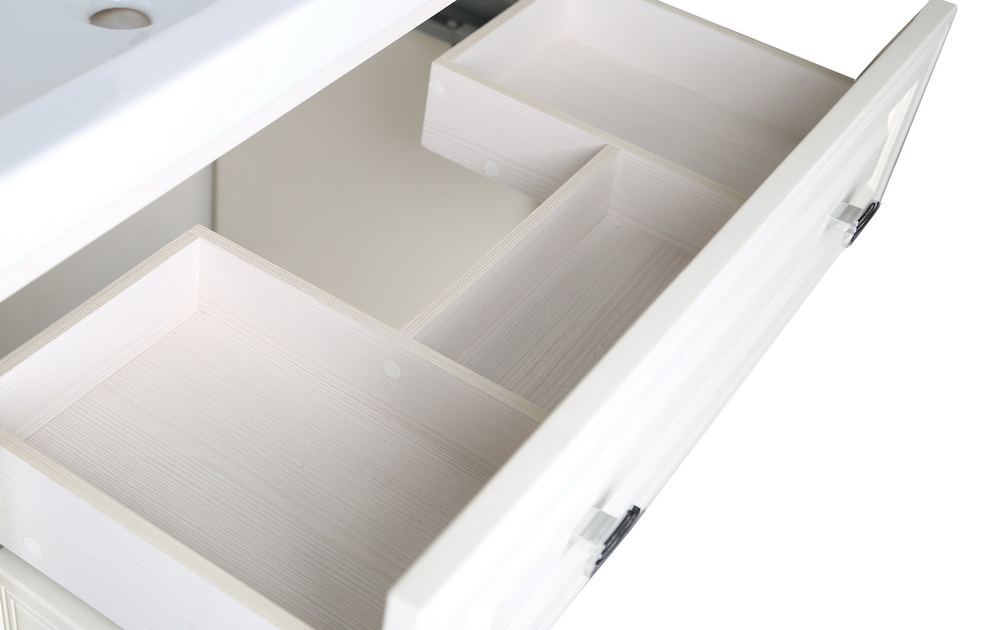 Верхний ящик тумбы разделен на 3 отсека для раскладывания предметов, в отделении с дверцами есть полка. Пенал имеет два отделения с дверцами, в верхнем установлены съемные стеклянные полки. Кроме того, в пенале есть небольшой выдвижной ящик. На ящиках и дверях установлены направляющие и доводчики европейского производства, они открываются плавно и тихо.